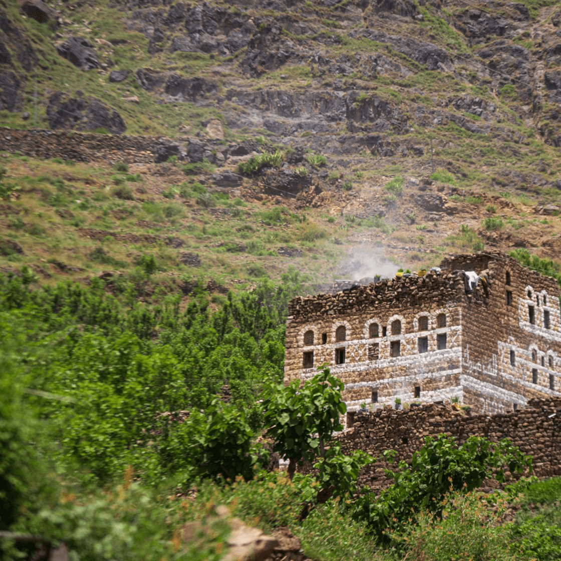 Attarah is an archaeological village in Haraaz, a mountainous, ancient region in the governorate of Sana’a. Haraaz is known as one of Sana’a best and oldests coffee growing communities, with over 1,500 coffee farming families. The area has lush valleys and highlands where many different types of crops are grown. However, coffee remains the most important. The stratospheric altitudes, where the coffee is grown, adds to the unique flavour profile of Haraazi coffee and the farmers believe that the coffee is so distinctive because of the region’s fertile soil. Over 90% of all the crops grown in Haraaz are coffee, making it Yemen’s largest coffee growing region.
